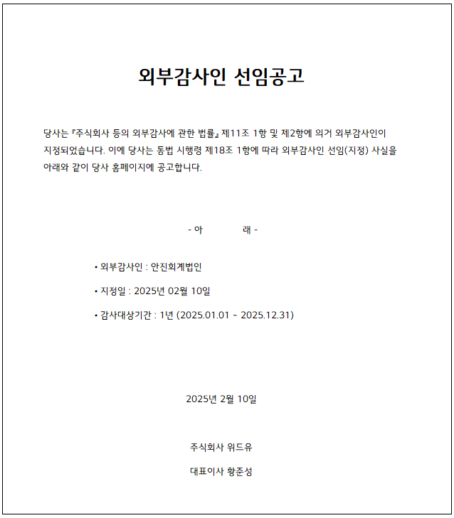 02/232024년 외부감사인 선임공고![20240223004042755.jpg 외부감사인 선임공고. 당사는 주식회사 등의 외부감사에 관한 법률 제11조 1항 및 제2항에 의거 외부감사인이 지정되었습니다. 이에 당사는 동법 시행령 제18조 1항에 따라 외부감사인 선임(지정) 사실을 아래와 같이 당사 홈페이지에 공고합니다. [아래] 외부감사인:삼정회계법인. 지정일:2023년 02월14일. 감사대상기간:1년(2024.01.01 ~ 2024.12.31). 2024년 02월 23일. 주식회사 위드유. 대표이사 황준성](/upload_files/editor/20240223004042755.jpg)